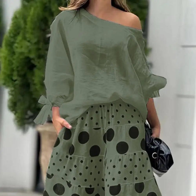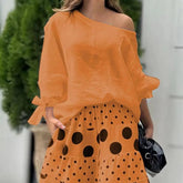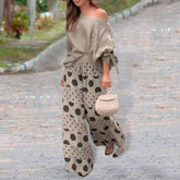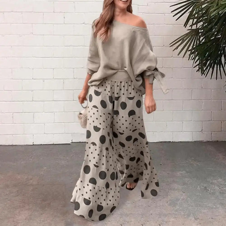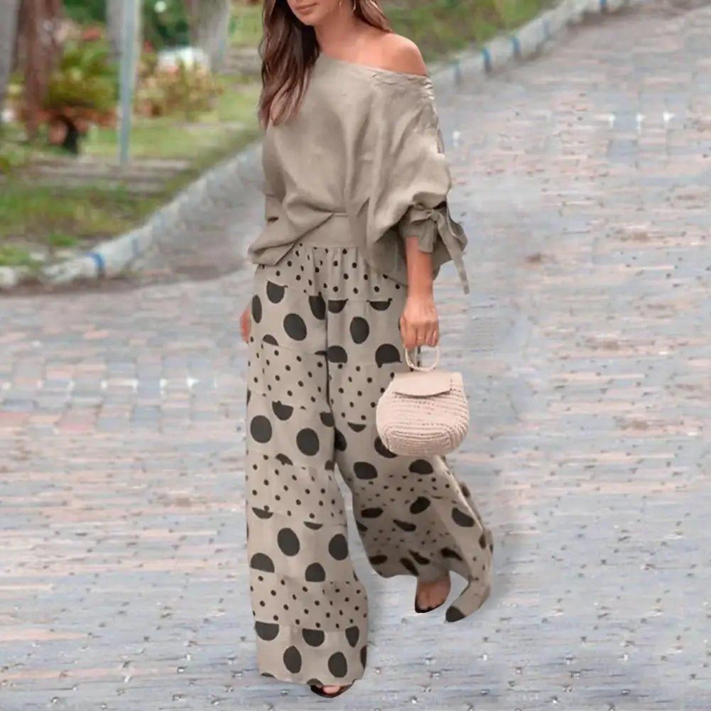 Step into a clean and stylish look with this 2-piece matching outfit designed for comfort and everyday fashion. The one shoulder slant neck top adds a modern touch, while the loose printed trousers keep things relaxed and easy to wear. The bow cuff detail gives a subtle feminine finish. Whether you're heading out for a casual day, a meetup, or a night out, this set keeps your outfit sorted without much effort.